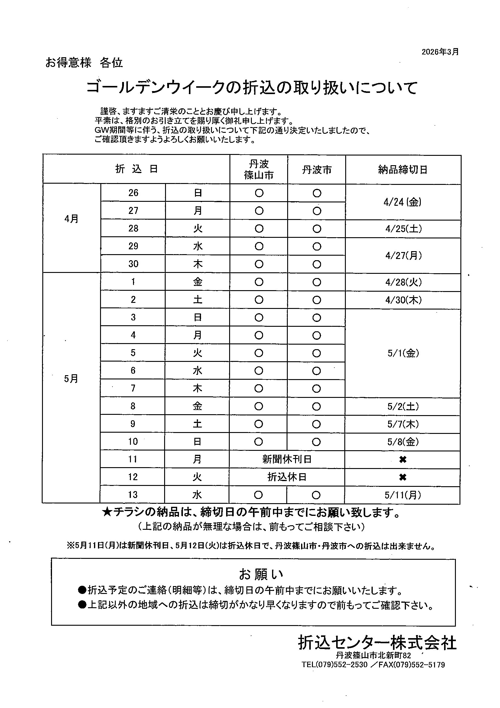 ゴールデンウィークのお取扱いについて